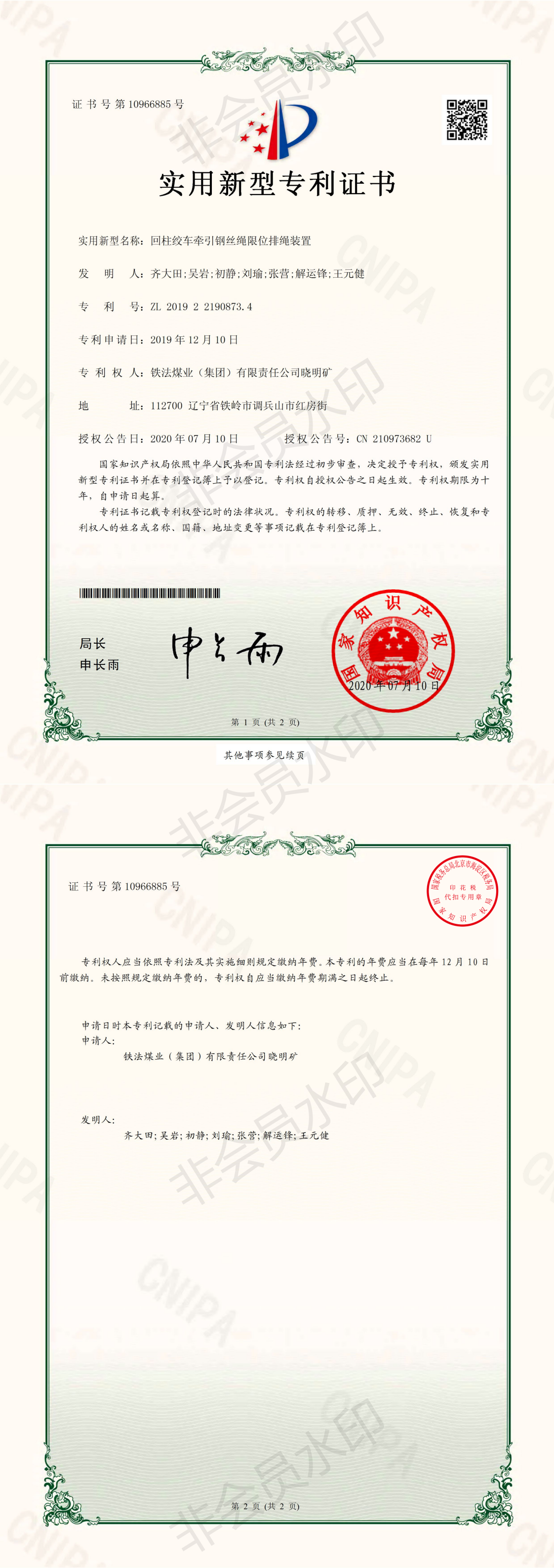 鐵法煤業(yè)(集團(tuán))有限責(zé)任公司曉明礦獲得一項實用新型專利授權(quán)——回柱絞車牽引鋼絲繩限位排繩裝置證書