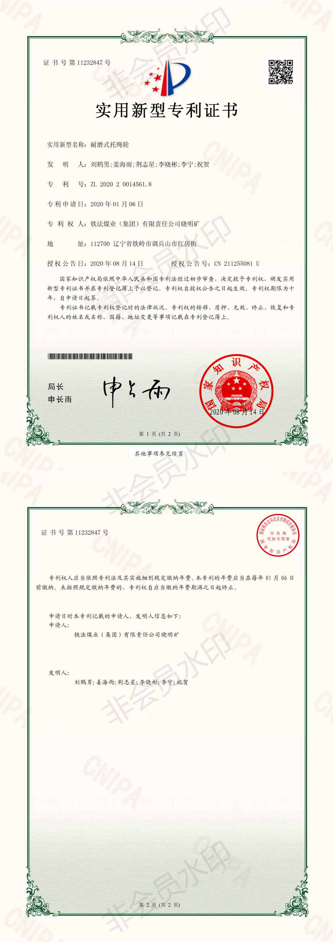 曉明礦耐磨式托繩輪獲得實(shí)用新型專利授權(quán)