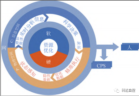 信息物理系統(tǒng) CPS (Cyber PhysicalSysG tems)是支撐信息化和工業(yè)化融合的綜合技術體系。近年來在各類新技術發(fā)展的驅(qū)動下,在部分行業(yè)得到了推廣應用。CPS 的本質(zhì)是構建一套信息空間與物理空間之間基于數(shù)據(jù)自動流動的狀態(tài)感 知、實時分析、科學決策、精準執(zhí)行的閉環(huán)賦能體系,提高資源配置效率,實現(xiàn)資源優(yōu)化。它是基于硬件、軟件、網(wǎng)絡、平臺構建的復雜系統(tǒng)。CPS 系統(tǒng)在對網(wǎng)絡內(nèi)部設備的遠程協(xié)調(diào)能力、自治能力、控制對象的種類和數(shù)量上,特別是網(wǎng)絡規(guī)模上遠超現(xiàn)有的工控網(wǎng)絡。CPS 系統(tǒng)在層級內(nèi)包含了傳統(tǒng)的可編程邏輯控制器 (PLC)、分布式控制系統(tǒng) (DCS),但與之相比,在傳輸模式上由總線變?yōu)榫W(wǎng)絡協(xié)議通信,更具開放性,并且由自動控制變?yōu)樾畔⒒瘋鲗J?,傳導范圍比區(qū)域控制變得更為廣泛,實現(xiàn)了互聯(lián)互通與廣泛的數(shù)據(jù)融合,可以解決礦山復雜系統(tǒng)控制、智能無人開采所需的技術支撐問題。信息物理系統(tǒng) CPS的本質(zhì)如圖3所示。