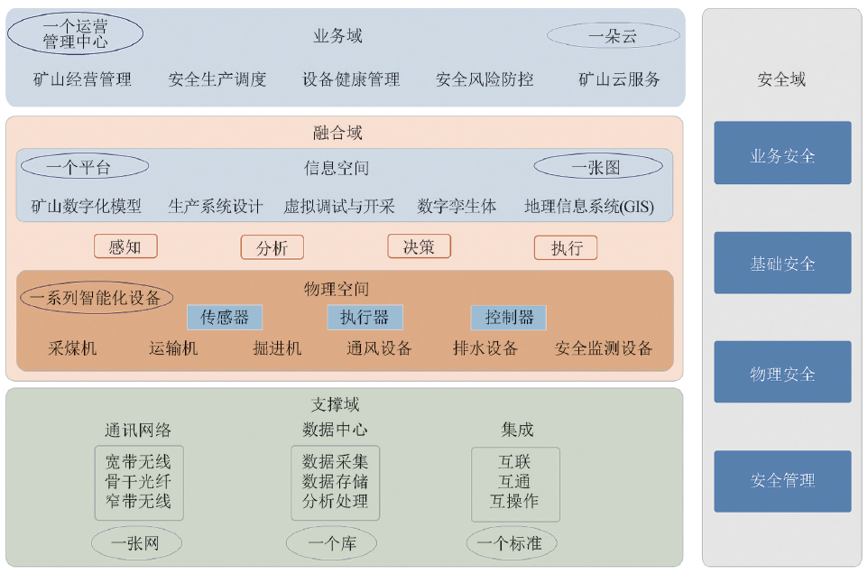 (2)在融合域,“一系列智能化設備”構成物理空間,“一張圖”與“一個平臺”包括各類三維仿真軟件、數(shù)字孿生體,構成信息空間。融合域?qū)崿F(xiàn)信息系統(tǒng)與物理系統(tǒng)交互映射與深度融合,從而實現(xiàn)礦山生產(chǎn)活動信息的智能感知、分析決策、工業(yè)自動化控制和安全生產(chǎn)監(jiān)控等。