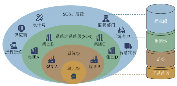 CPS系統(tǒng)具有可擴展性和延展性,可不斷向更高層級發(fā)展,實現(xiàn)對人才、技術、資金等資源和要素的高效整合。在MCPS系統(tǒng)建設中,可構建單元級、系統(tǒng)級、系統(tǒng)之系統(tǒng)級 (SOS)、SOS 擴展級應用,分別對應于煤礦子系統(tǒng)級、礦級、集團級、行業(yè)級的MCPS系統(tǒng)。在子系統(tǒng)級主要實現(xiàn)系統(tǒng)內(nèi)的智能感知、分析決策與控制;在礦級主要實現(xiàn)全礦井安全生產(chǎn)管控;在集團級主要實現(xiàn)生產(chǎn)經(jīng)營決策管理;在行業(yè)級主要面向行業(yè)設計、運維服務、上下游產(chǎn)業(yè)鏈、政府監(jiān)管等,實現(xiàn)工業(yè)互聯(lián)網(wǎng)云端的服務與管理。在整個層級中,集團級服務于礦級,行業(yè)級服務于集團級,最終圍繞礦級進行管理與決策。礦級是整個層級擴展的核心,也是其他層級的基礎,是MCPS系統(tǒng)建設的重點。MCPS系統(tǒng)層級如圖5所示。