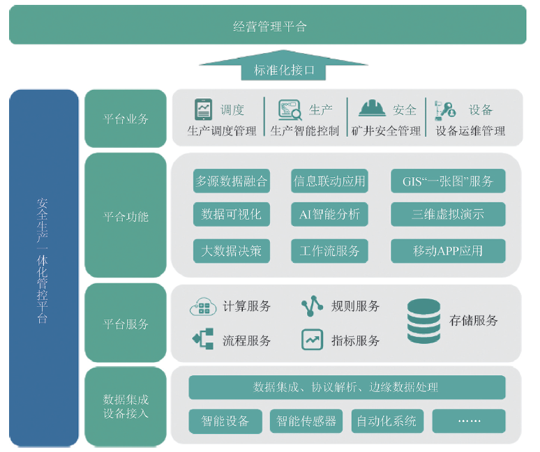 (4)“一個平臺”面向智能礦山實現(xiàn)煤礦安全生產(chǎn)信息感知、計算、控制、執(zhí)行的安全生產(chǎn)管控一體化平臺,用于管理運行各智能生產(chǎn)系統(tǒng)與設備,實現(xiàn)礦山生產(chǎn)無人值守、系統(tǒng)聯(lián)動、數(shù)據(jù)融合和調(diào)度管理。