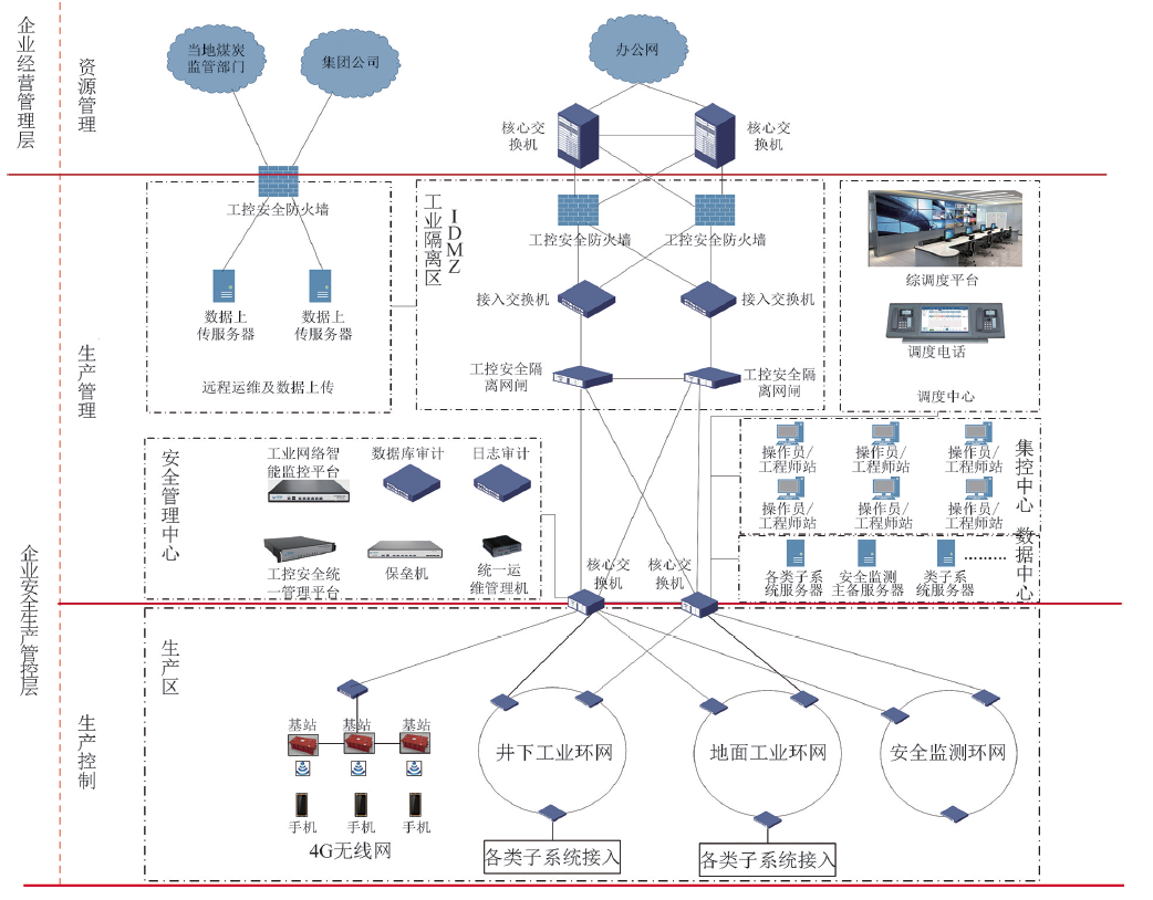 (3)以“生產(chǎn)安全、網(wǎng)絡安全”為保障,提供安全服務。目前煤礦生產(chǎn)安全保障系統(tǒng)是智能煤礦的重要建設內(nèi)容,如“六大避險系統(tǒng)”以及“風險預控系統(tǒng)”都已作為礦井安全的建設重點,但在信息化時代,網(wǎng)絡安全也是重中之重,要與生產(chǎn)安全放在同等地位。煤礦要建設安全生產(chǎn)控制專網(wǎng),在生產(chǎn)控制專網(wǎng)與企業(yè)辦公網(wǎng)之間,構建工業(yè)安全隔離區(qū),實現(xiàn)礦山信息的安全性。在企業(yè)經(jīng)營管理層、企業(yè)安全生產(chǎn)管控層形成以工業(yè)信息安全防護為重點的縱深防御,利用工業(yè)隔離網(wǎng)閘、工業(yè)網(wǎng)絡審計、工業(yè)態(tài)勢感知等技術手段,幫助礦山實現(xiàn)工業(yè)信息安全保障能力建設。煤炭企業(yè)典型網(wǎng)絡安全防護拓撲圖如圖 9 所示。