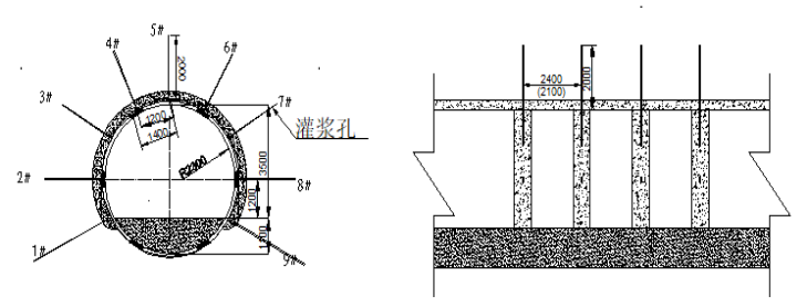2.承壓蓋板施工工藝。劈裂注漿孔口均勻布置在巷道輪廓線上,每排布置9個(gè)劈裂注漿孔,眼孔間距1.2m,兩側(cè)最下排劈裂注漿孔角度不小于45°,深度4m;其余眼孔深度2m,巷道原支護(hù)棚距0.6m時(shí),排距為2.4m;棚距0.7m時(shí),排距為2.1m,見圖1。漿液采用水固比0.52:1的復(fù)合可控水泥漿液,其中劈裂注漿劑占固料的8%、Po52.5級(jí)普通硅酸鹽水泥占固料的92%。利用寸管加工成長度為1.2m注頭進(jìn)行劈裂注漿,劈裂注漿壓力≥3MPa時(shí)停止劈裂注漿。劈裂注漿采用ZBY50/7-11型電泵劈裂注漿。