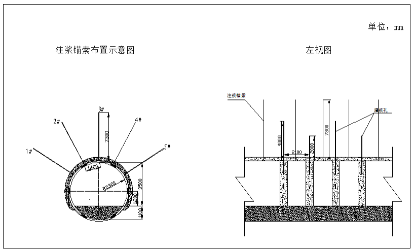 3.注漿錨索施工。注漿錨索規(guī)格為Ф21.8×7300mm,布置形式為在巷道頂板正中布置1根,以此錨索為基準(zhǔn)向兩幫每間隔1.4m施工1根錨索,每排布置5根錨索。巷道原支護(hù)棚距0.6m時(shí),排距為1.2m;棚距0.7m時(shí),排距為1.4m,見圖2。漿液采用MZM70無機(jī)注漿料配制,水灰比為1:3.2。注漿壓力≥8MPa時(shí)或注漿錨索孔口外側(cè)有漿體擠出為停止注漿標(biāo)準(zhǔn)。注漿錨索采用QZB-15/9型氣動(dòng)注漿泵注漿。