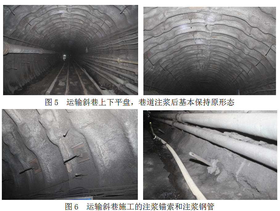 5.深部圍巖注漿錨索注漿加固施工及目的。在巷道噴漿構(gòu)筑承壓蓋板后,可利用注漿錨索對(duì)巷道3~5m深處圍巖進(jìn)行進(jìn)一步的注漿加固,最大注漿壓力可達(dá)8MPa。其目的在于,在單獨(dú)進(jìn)行淺部圍巖注漿加固不能滿足要求的情況,利用注漿錨索對(duì)深部圍巖進(jìn)行更大范圍和更高強(qiáng)度的加固。同時(shí)實(shí)現(xiàn)注漿錨索的全程錨固。