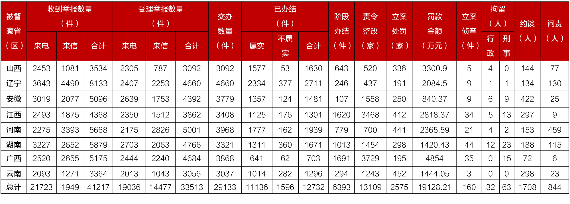 有關?。▍^(qū))高度重視督察工作,將督察作為堅決貫徹習近平生態(tài)文明思想的重要內(nèi)容,作為推動高質(zhì)量發(fā)展的重要契機,黨政主要領導通過督察動員、現(xiàn)場督辦、召開專題會議,以及加強約談問責和立案查處等方式,大力推動督察配合和整改落實。截至5月9日,各督察組受理轉辦的29133件群眾舉報(未計重復舉報),已辦結12732件,階段辦結6393件;立案處罰2575家,罰款19128.21萬元;立案偵查160件,拘留95人;約談黨政領導干部1708人,問責844人(詳見附表)。