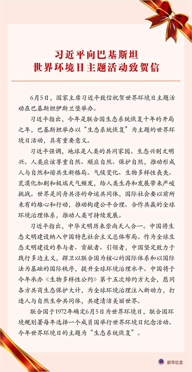 新華社北京6月5日電6月5日,國家主席習近平致信祝賀世界環(huán)境日主題活動在巴基斯坦伊斯蘭堡舉辦。