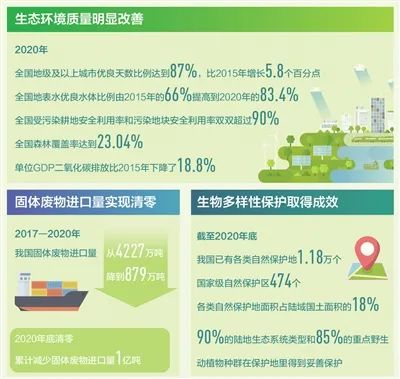 2020年,全國地級及以上城市優(yōu)良天數(shù)比例達到87%,比2015年增長5.8個百分點;PM2.5未達標地級及以上城市平均濃度達到37微克/立方米,比2015年下降28.8%;全國地表水優(yōu)良水體比例由2015年的66%提高到2020年的83.4%,劣Ⅴ類水體比例由2015年的9.7%下降到了2020年的0.6%;全國受污染耕地安全利用率和污染地塊安全利用率雙雙超過90%;全國森林覆蓋率達到23.04%,自然保護區(qū)以及各類自然保護地面積占到陸域國土面積的18%;單位GDP二氧化碳排放比2015年下降了18.8%。
