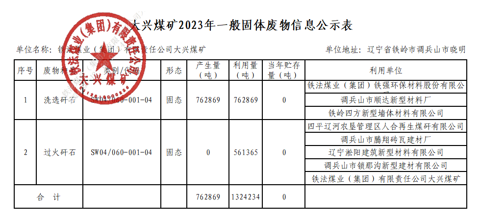 大興礦2023年度固體廢物污染環(huán)境防治信息