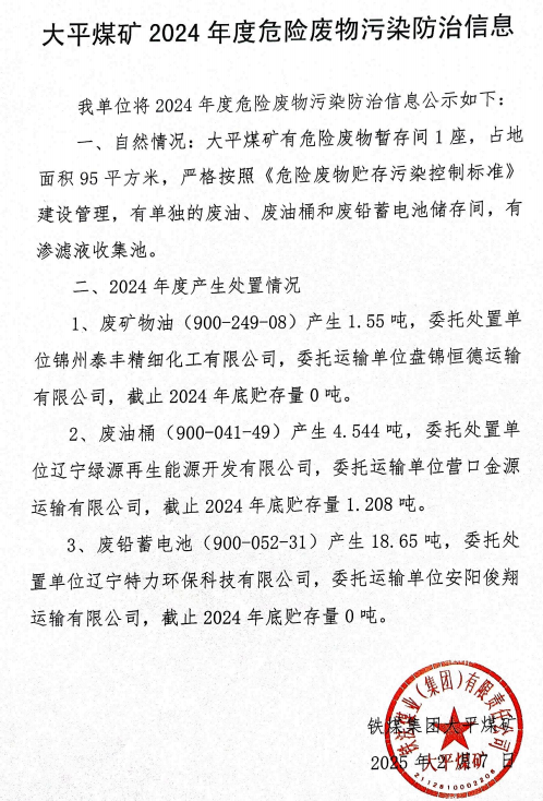 大平礦2024年度固體廢物污染環(huán)境防治信息
